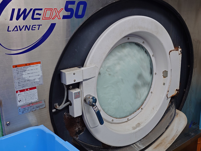 80℃以上の熱水と専用洗剤で洗いとすすぎを繰り返し、次亜塩素酸ナトリウムで除菌・抗菌処理し脱水します。