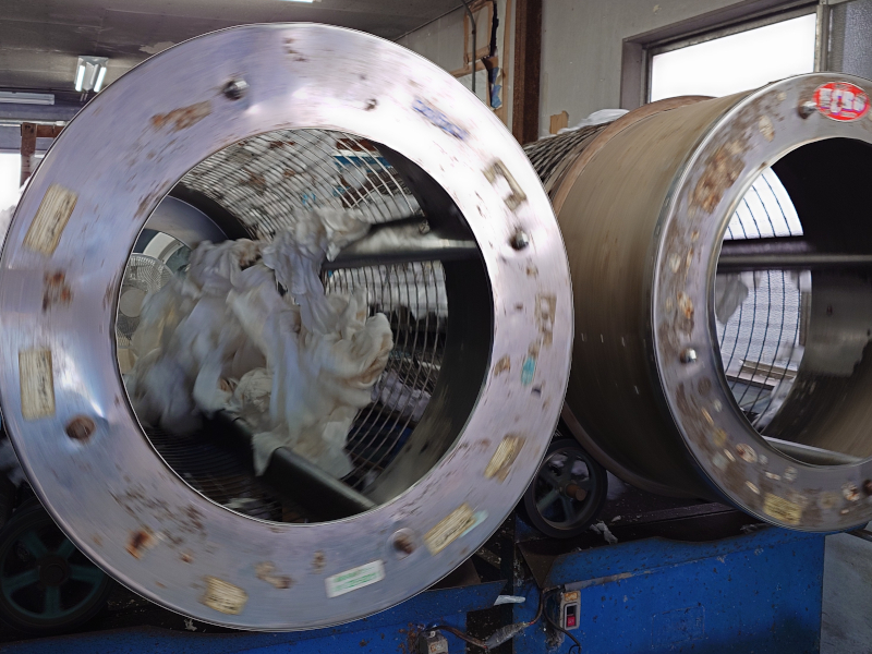 回収した使用済みおしぼりを大型タンブラーに運び、包装フィルム等の異物を取り除きます。