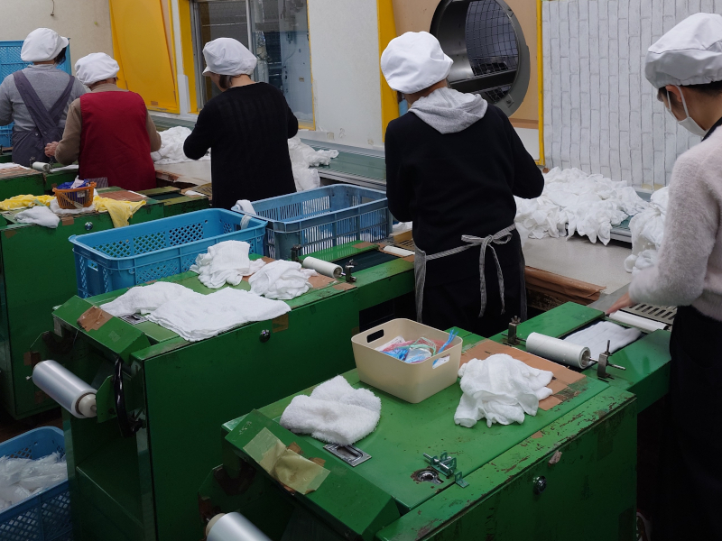 スタッフがおしぼりを選別し二つ折りにして、自動包装機で袋に入れます。